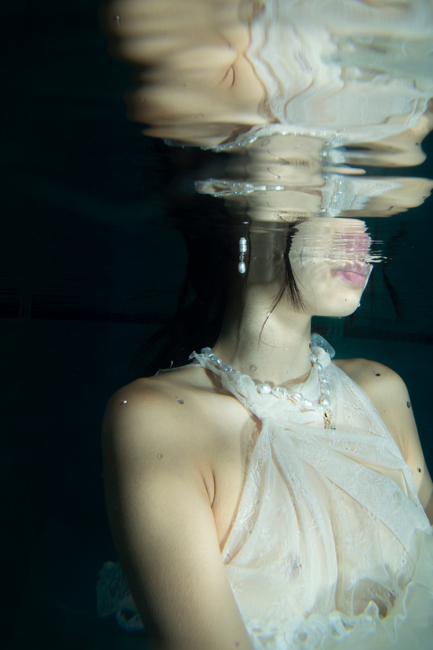 Inspired by the euphoric moments of swimming through sun glistening water — A single pearl surrounded by shining diamonds and an ocean blue aquamarine.