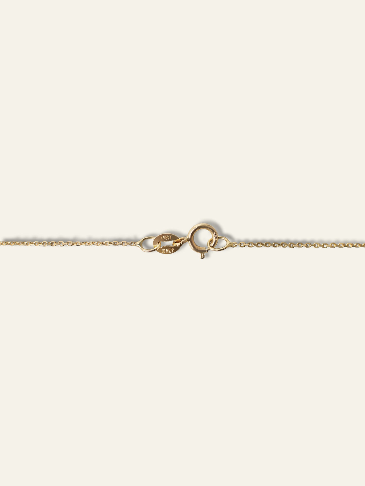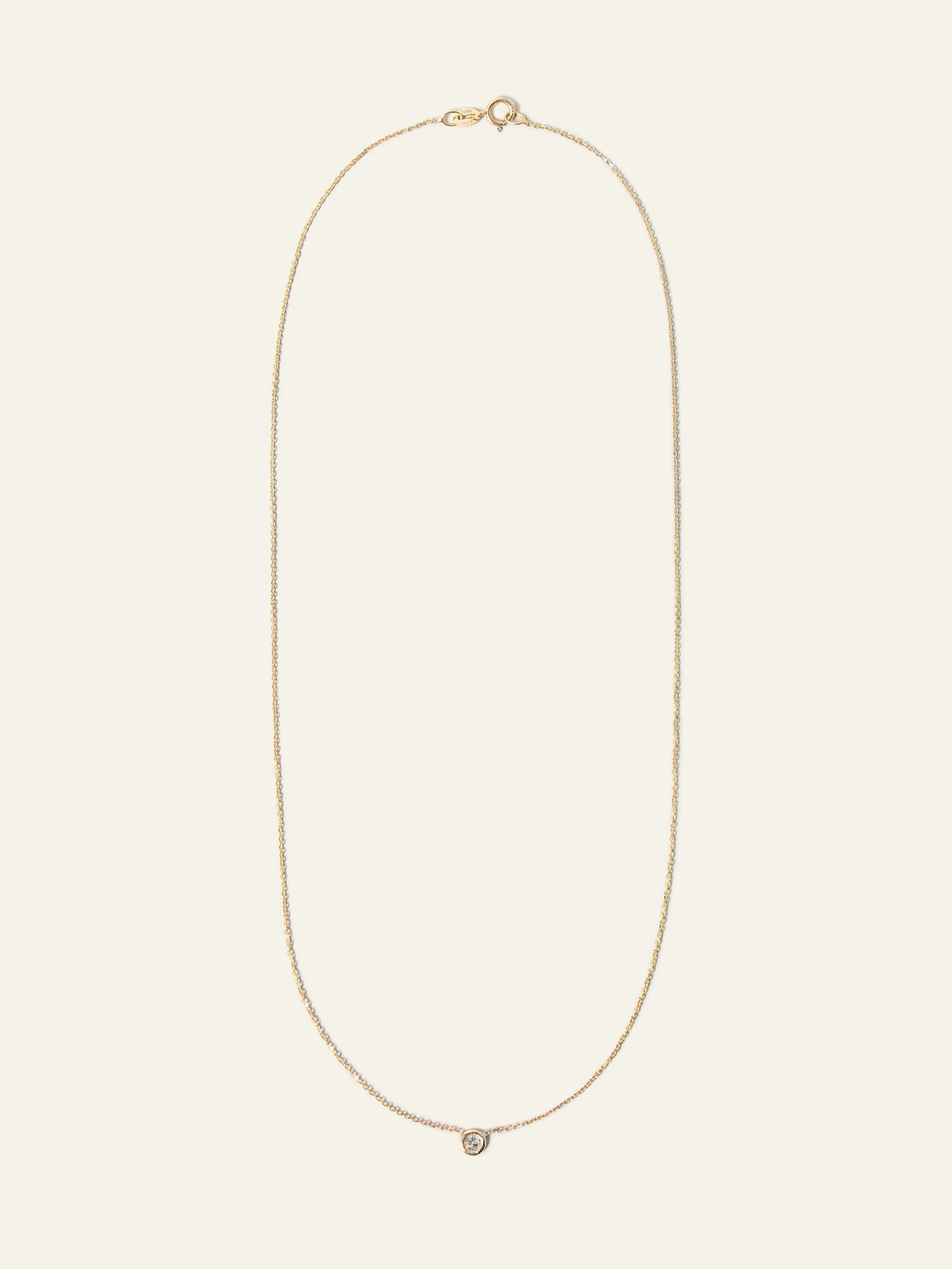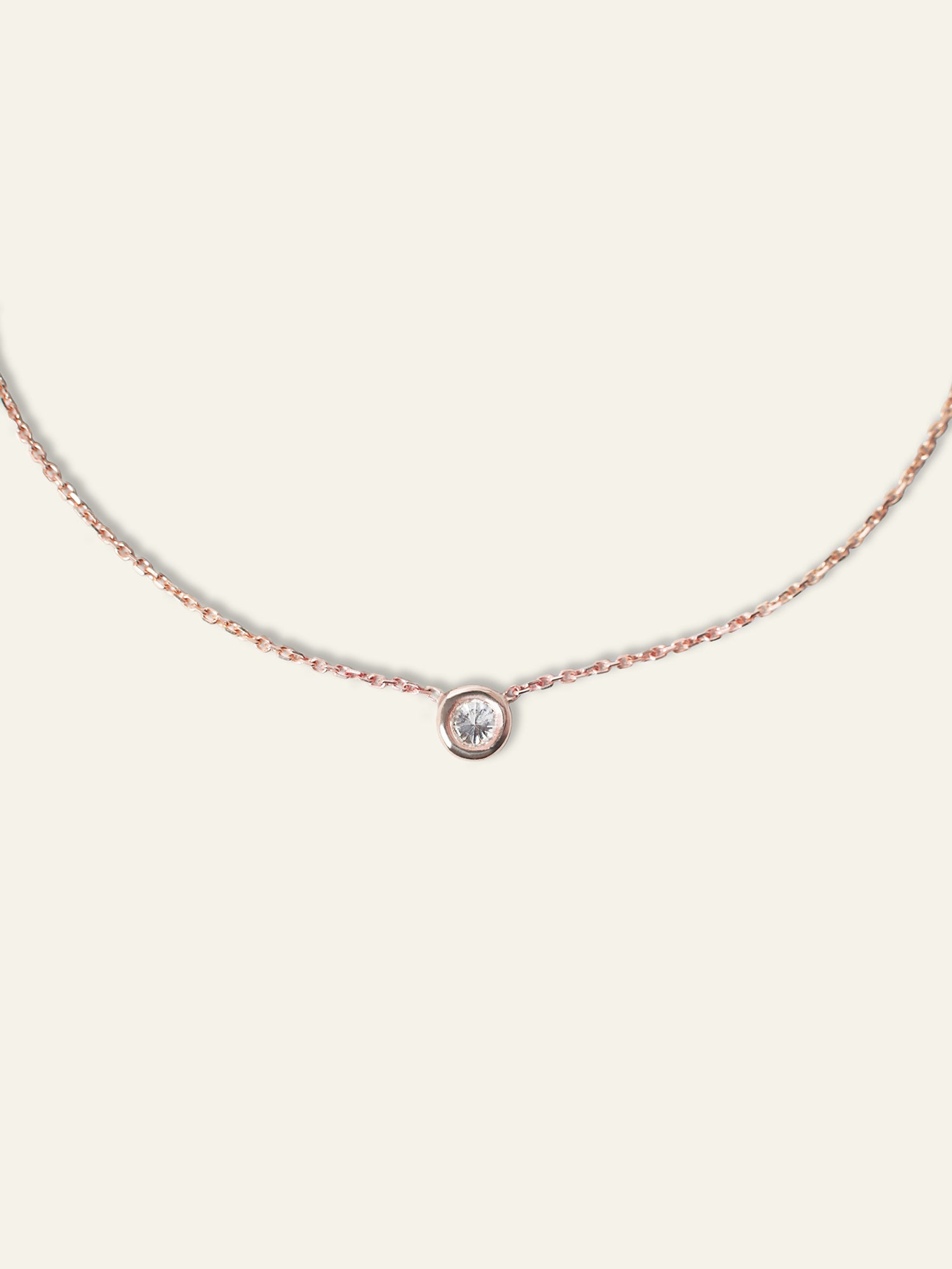 A simple, single diamond necklace that both shines lustrously on its own, and also layers well with other friends. Available in 14K yellow, rose, or white gold.