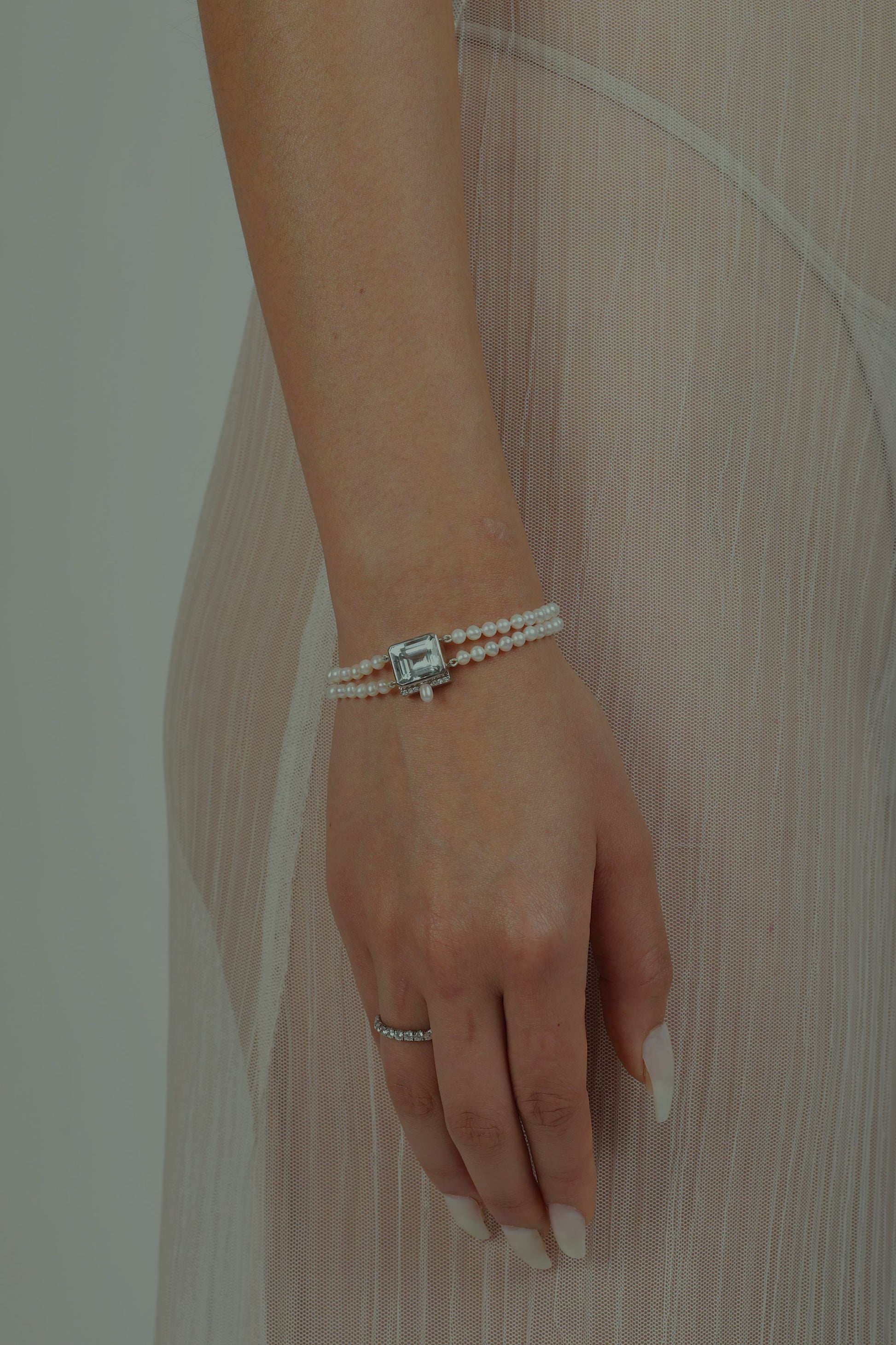 The Mazu Pearl Bracelet features a double-strand of Freshwater pearls with a six carat Brazilian Aquamarine surrounded by a pavé of diamonds + oval pearl drop.